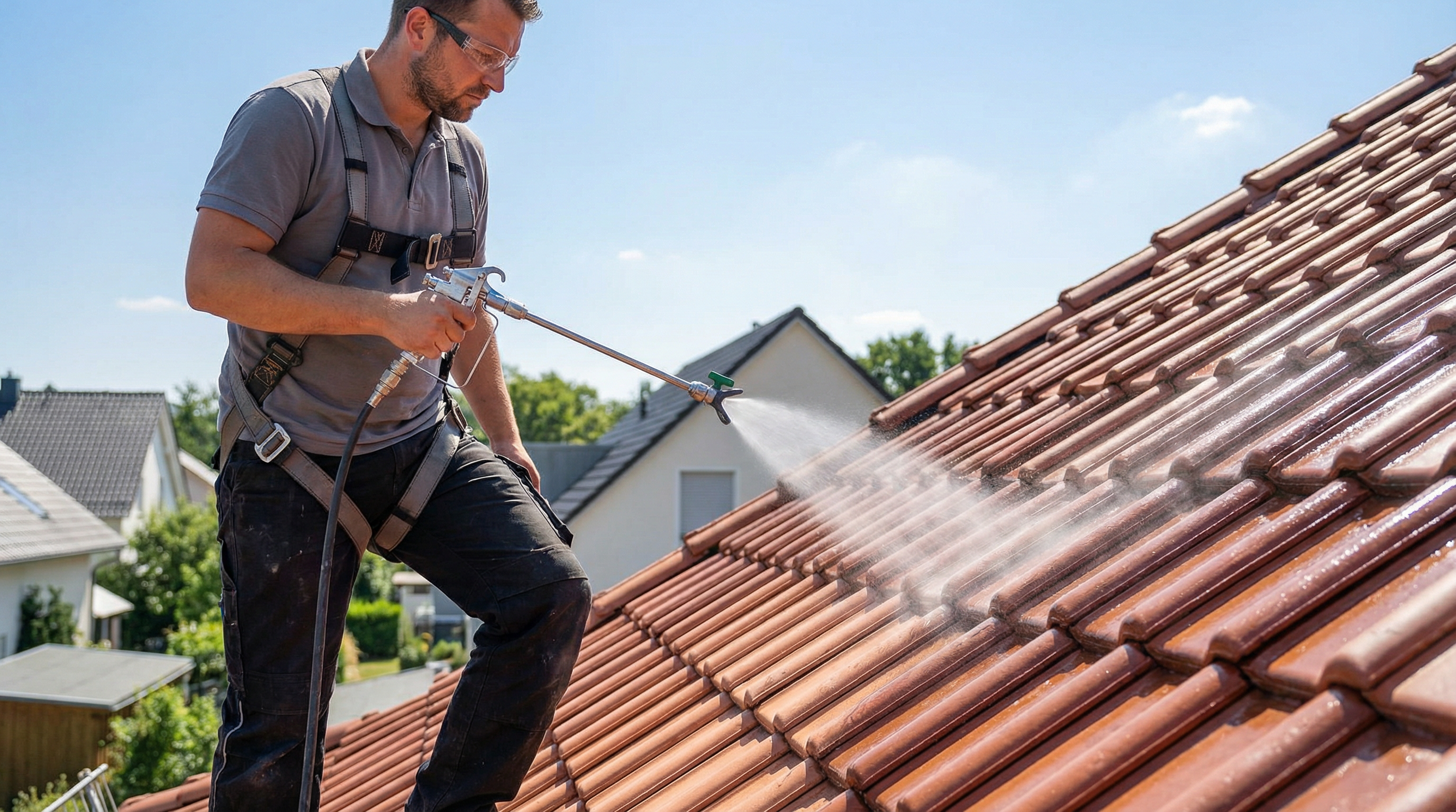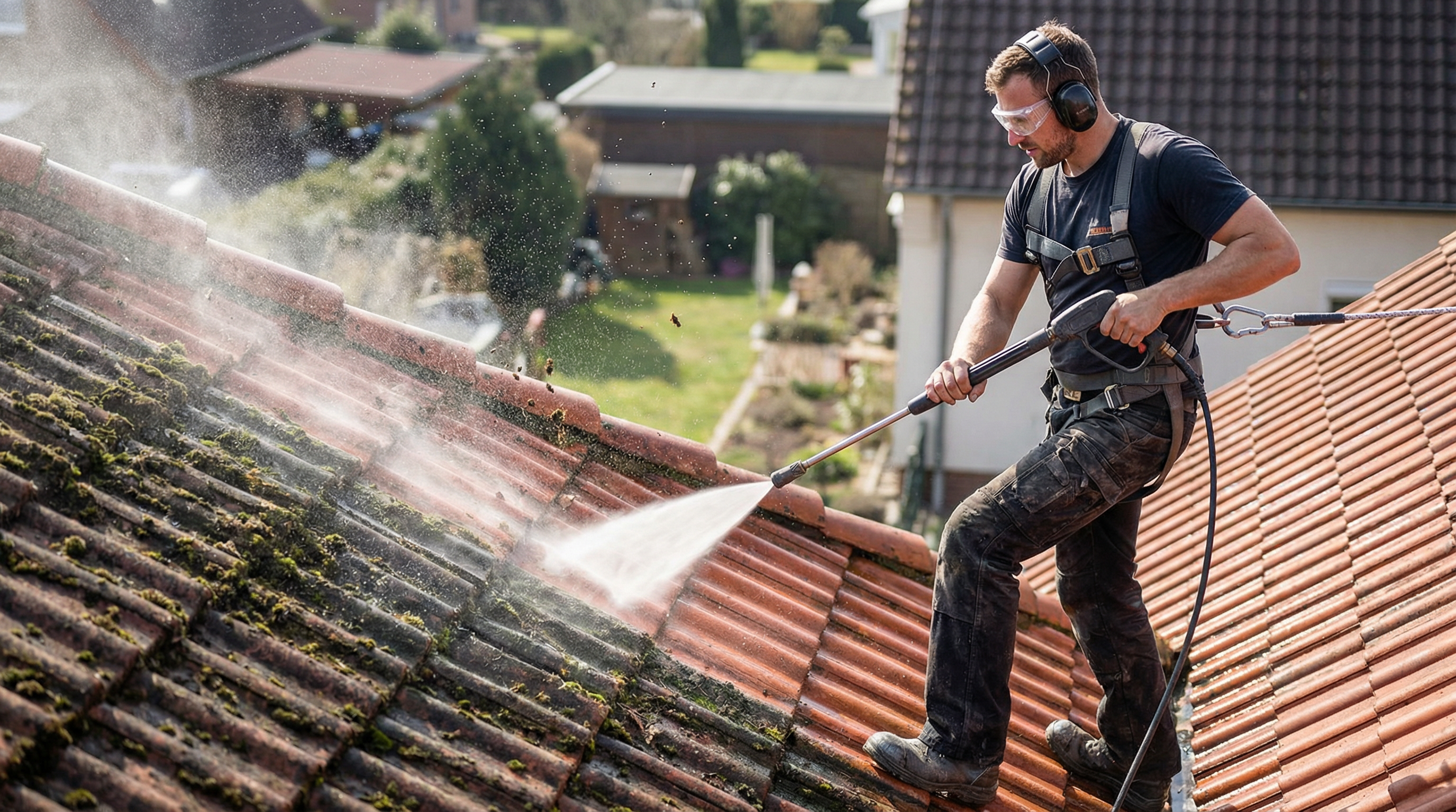 Unsere Dachreinigung erfolgt mit professionellen Hochdruckreinigern, deren Druck je nach Ziegelmaterial individuell reguliert wird. Bei empfindlichen Tonziegeln arbeiten wir mit reduziertem Druck, bei robusten Betondachsteinen (z.B. Frankfurter Pfanne) kann der Druck entsprechend angepasst werden. So garantieren wir eine gründliche Reinigung ohne Beschädigung Ihrer Dachziegel. Die fachgerechte Anwendung durch unser geschultes Personal verhindert Schäden an der Dachsubstanz.